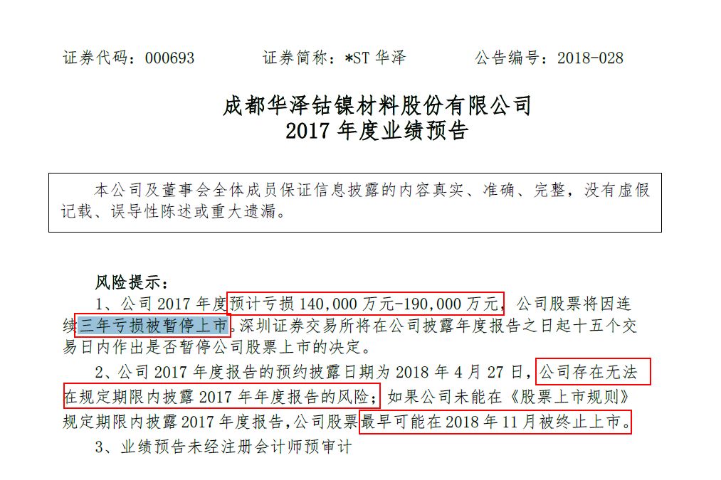 1、公司(*ST华泽)预计2017年亏损14-19亿元,公司将因连续三年亏损被暂停上市。