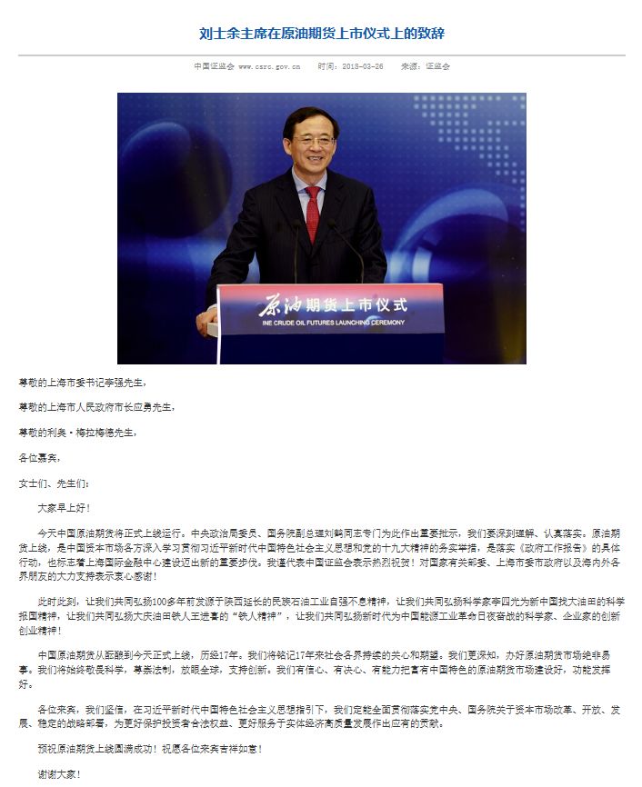 证监会主席刘士余在上市仪式上还做了致辞。他在致辞中是这么说的:中国原油期货从酝酿到今天正式上线,历经17年。我们将铭记17年来社会各界持续的关心和期望。
