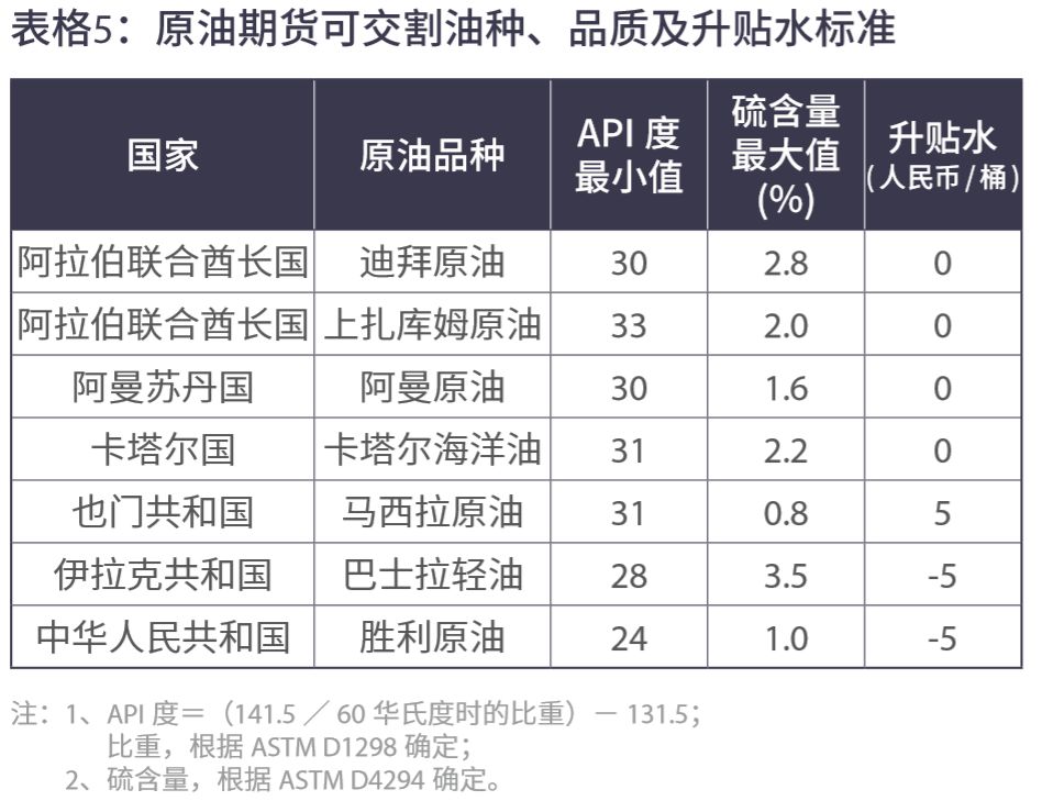 根据《上海国际能源交易中心原油期货标准合约》和《上海国际能源交易中心交割细则》有关规定,对原油期货可交割油种、品质及升贴水规定如下: