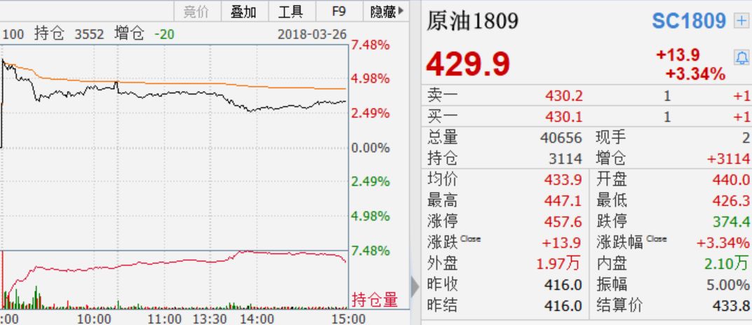 原油期货上市首日共推出20个合约,从今日运行情况看,主力合约1809成交40656手。持仓总量3114手,最终主力合约收盘价429.9元/桶,涨13.9元/桶,涨幅3.34%。