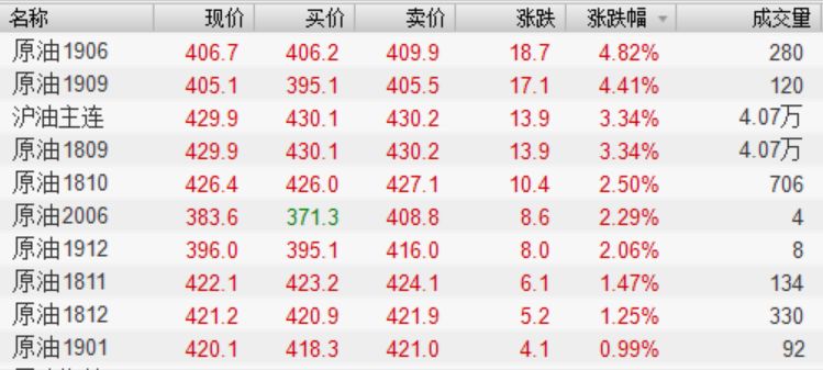 除了主力合约之外,其余合约也呈现一片上涨。其中原油1906合约涨幅最大,大涨4.82%,原油1909合约涨幅居次,也上涨4.41%。除1903合约微跌0.24%外,其他合约全部上涨。