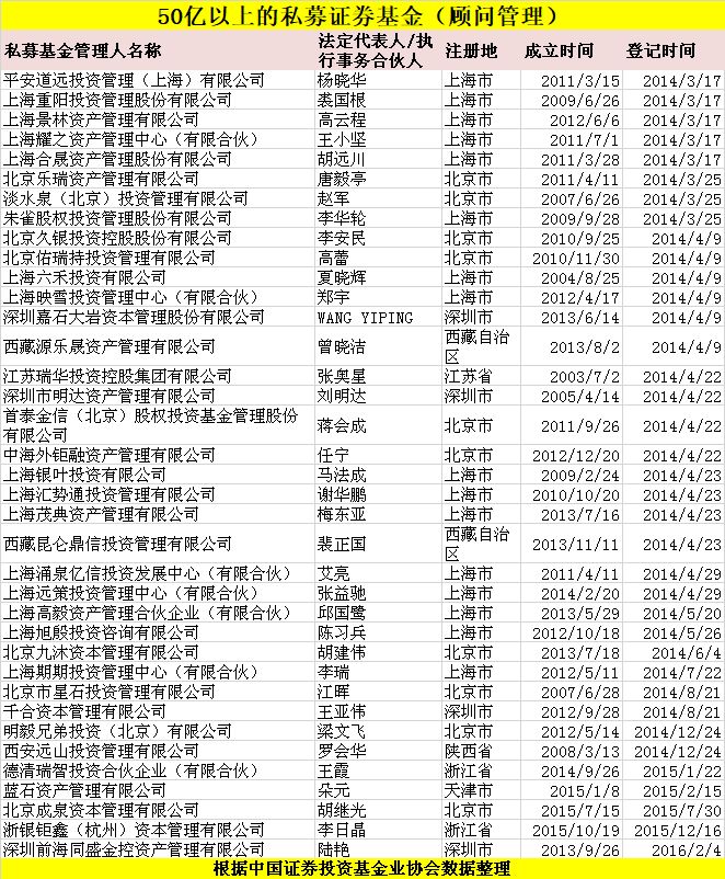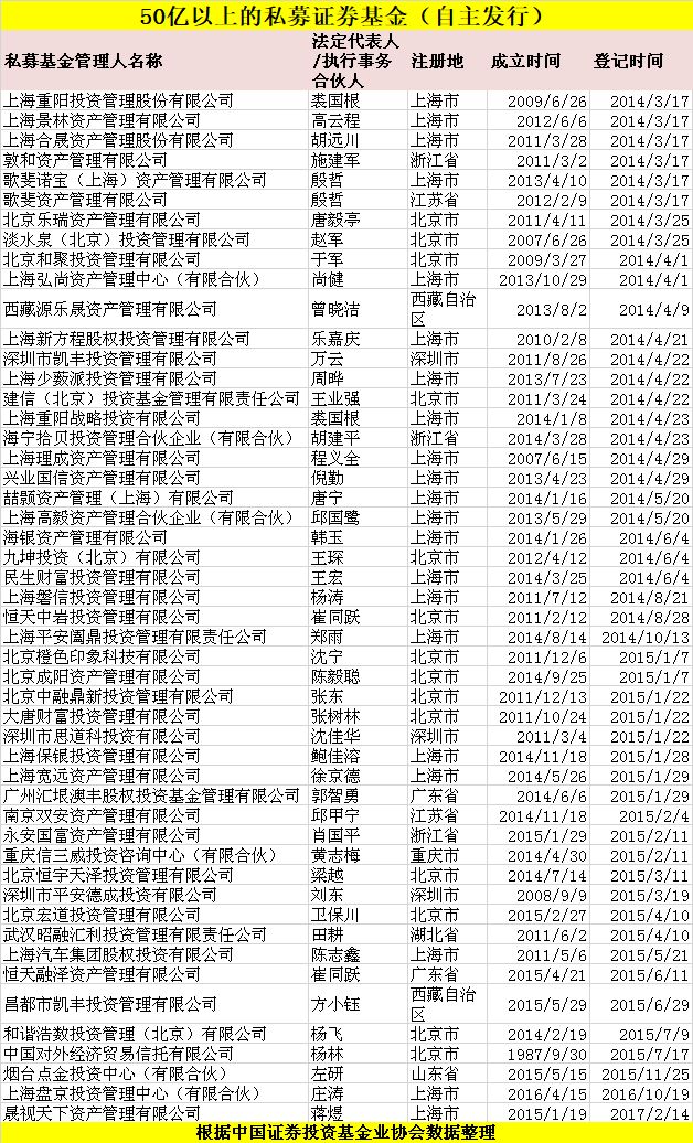 先看大型证券私募的情况,协会数据显示,截至4月17日,规模在50亿以上的证券私募(自主发行)有50家,包括重阳投资、景林资产、淡水泉投资、北京和聚投资等。