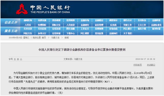 耀之资产表示,央行此次降准100BP,幅度之大颇为罕见,从历史上来看,降准幅度大多是50BP。央行表示将使用降准释放的资金偿还银行所借央行的中期借贷便利(MLF),但耀之资产更倾向于解读为是货币政策转向的信号。客观来看,中美贸易摩擦、一季度经济有放缓迹象以及即将出台的资管新规,都将对金融市场造成负面冲击,央行降准的政策,对市场是比较大的利好。