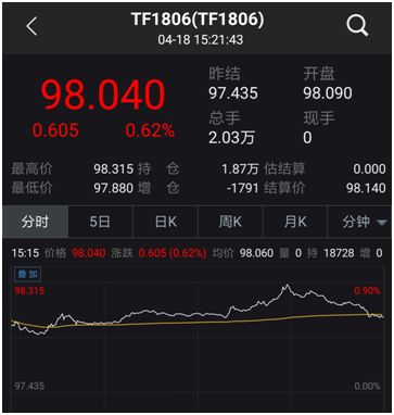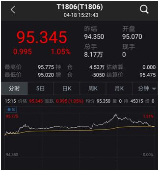 消息出来后,国债期货今日大涨,10年期国债期货主力合约T1806收盘涨1.05%,盘中最大涨幅1.51%,刷新自2017年7月以来新高,创近16个月最大单日涨幅。