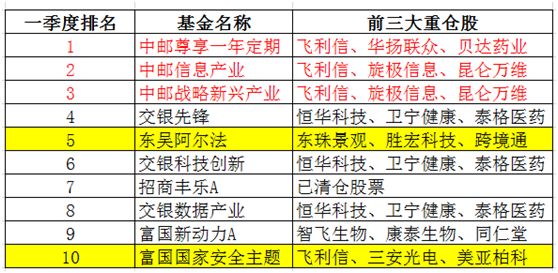 一季度,中小创异军突起,生物科技、云计算、人工智能、高端制造等新兴产业个股走强,重仓相关个股的基金纷纷进入业绩前十。Wind数据显示,中邮尊享一年定期以27.94%的收益率位列主动偏股基金一季度业绩头名,中邮信息产业以23.91%的收益率紧随其后,排名第三的中邮战略新兴产业录得21.85%的收益率。业绩位列第四至第十的主动偏股型基金分别为交银先锋、东吴阿尔法、交银科技创新、招商丰乐A、交银数据产业、富国新动力A和富国国家安全主题。