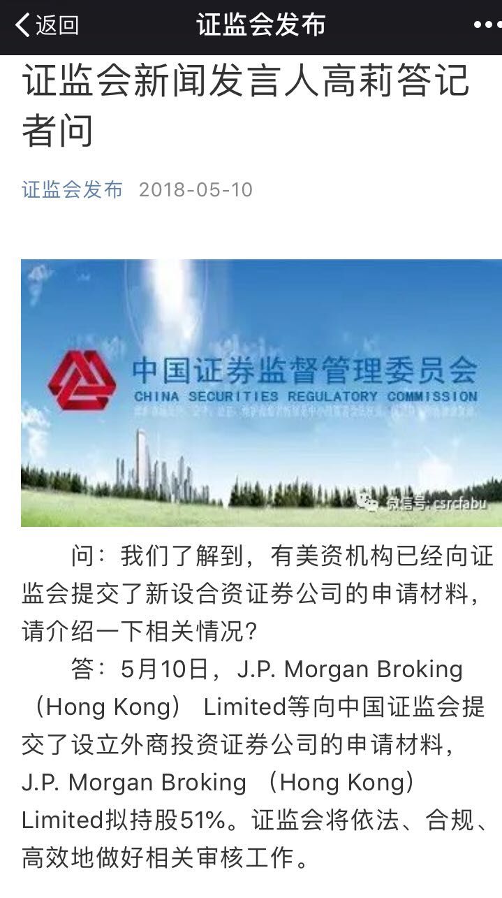 5月10日,证监会新闻发言人高莉在回答记者关于有美资机构已经向证监会提交了新设合资证券公司的申请材料的提问时表示,5月10日,J.P. Morgan Broking (Hong Kong)Limited等向中国证监会提交了设立外商投资证券公司的申请材料,J.P. Morgan Broking (Hong Kong)Limited拟持股51%。证监会将依法、合规、高效地做好相关审核工作。