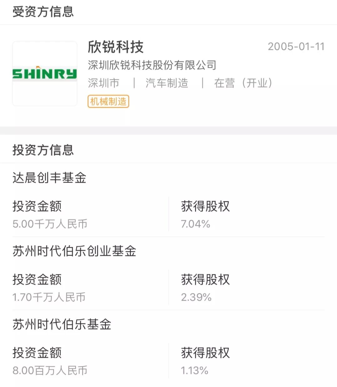 欣锐科技招股书未详细披露当时的投资金额,查询清科私募通APP显示,2015年4月14日,达晨创投、时代伯乐合计投资欣锐科技10.56%股权,投资金额7500万元;IPO后持股比例有所变化。