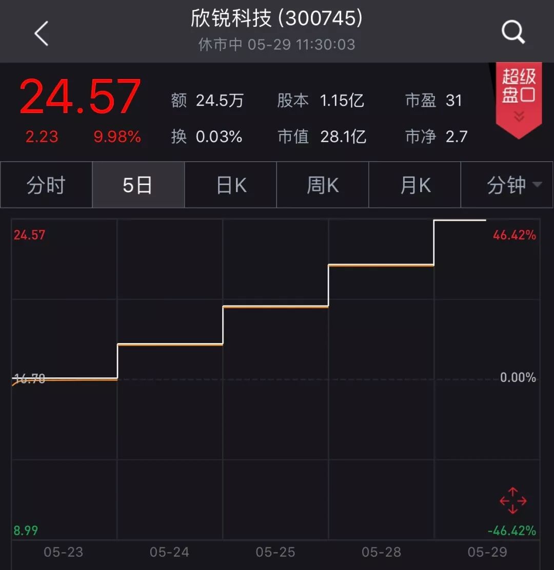 5月23日,欣锐科技上市,发行价11.65元,开盘价15.38元,首日大涨44.03%,直到昨天已连板5个交易日,目前股价24.57元。