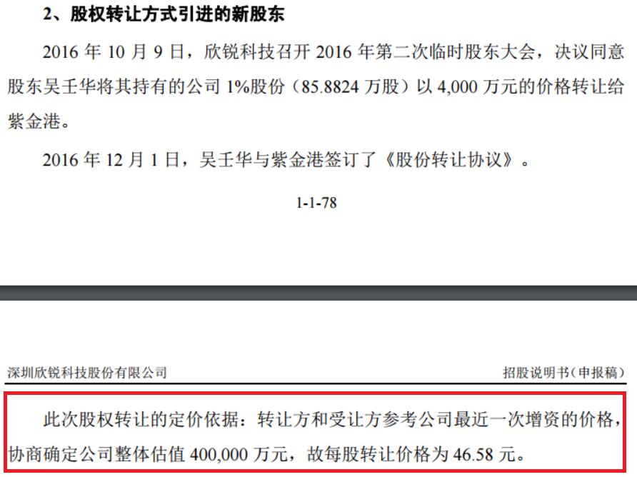 2016年12月,欣锐科技还完成了一次股权转让,股东吴壬华将所持的1%股份(85.8824万股),以4000万元的价格转让给紫金港资本。招股书中说明:转让方和受让方参考最近一次增资的价格,协商确定公司整体估值40亿元,每股转让价格46.58元。