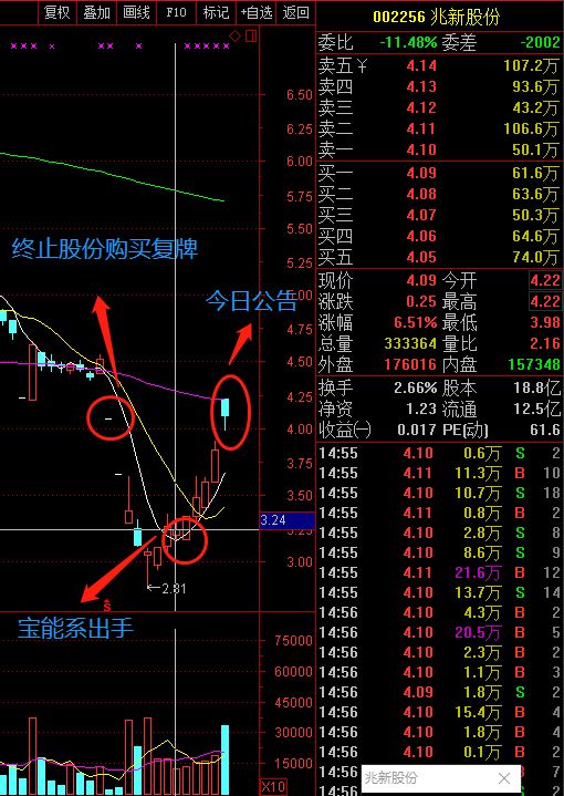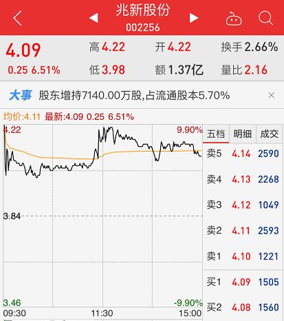 今日披露宝能系举牌,兆新股份股价高开震荡逆势大涨6.51%。
