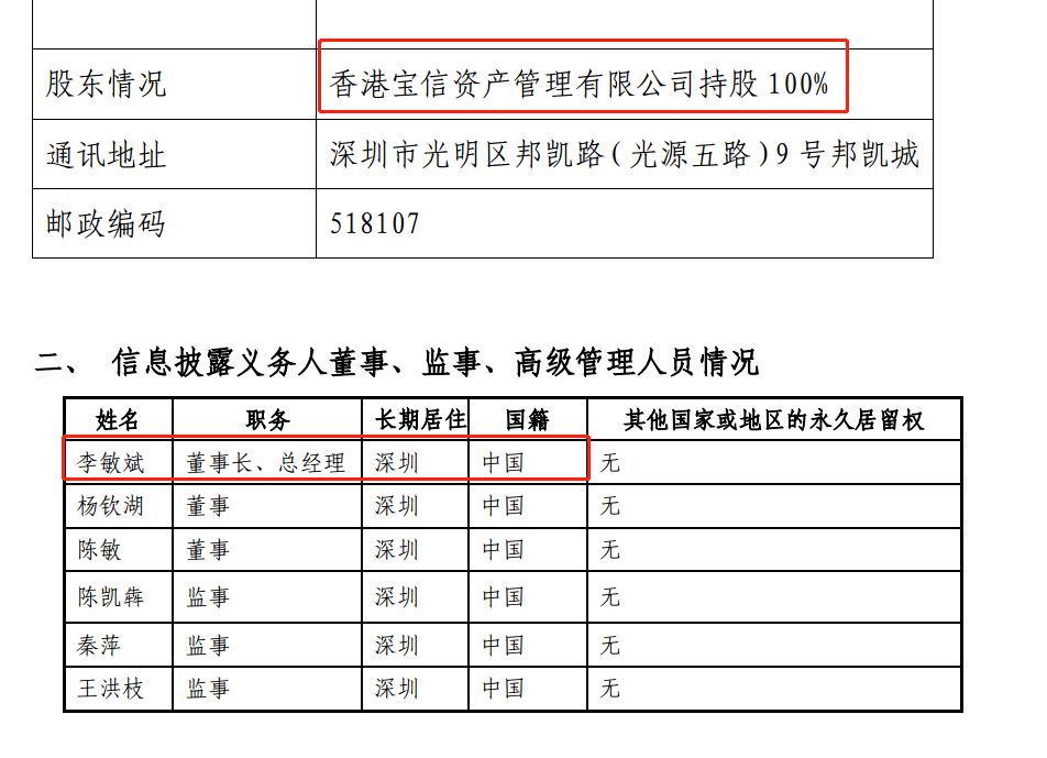 公告仅显示,深圳宝信为香港宝信资产管理有限公司100%持股,高管中董事长为李敏斌。