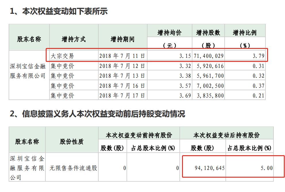 资料显示,深圳宝信先是7月11日通过大宗交易买入7140万股,占比3.79%;而7月11日当天刚好发生两笔大宗交易,一笔为3591.81万股,一笔为3548.2万股,两笔合计刚好为7140万股。