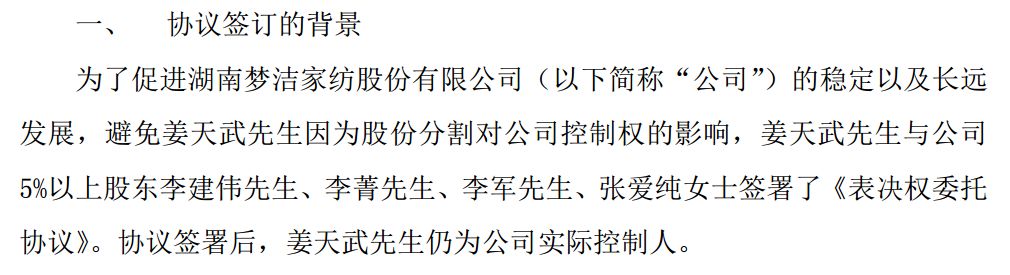 为了解决上述问题,姜天武的选择是搬救兵。姜天武与梦洁家纺另外四位重要股东李建伟、李菁、李军、张爱纯分别签署了《表决权委托协议》,即后四人将其所持股份的表决权委托给姜天武,协议签署后,姜天武先生仍为公司实际控制人。