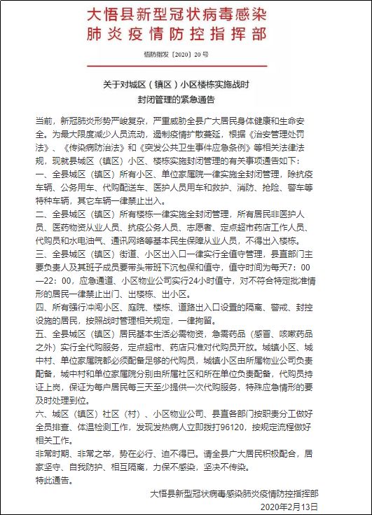 图:大悟县对城区(镇区)小区楼栋实施战时封闭管理的紧急通告