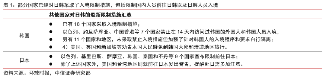 日韩的疫情快速爆发引发了全球对疫情能否得到控制以及全球经济增长放缓的担忧。截至2月25日《环球时报》最新消息,部分国家已经对日韩采取了入境限制措施,包括限制国内人员前往日韩以及日韩人员入境。若疫情进一步升级,将会有更多国家采取入境限制措施,以及往来贸易、航班、旅游暂停等措施。若日韩疫情继续扩散,他国对两国限制措施升级,料会对全球经济、贸易产生明显的负面冲击。