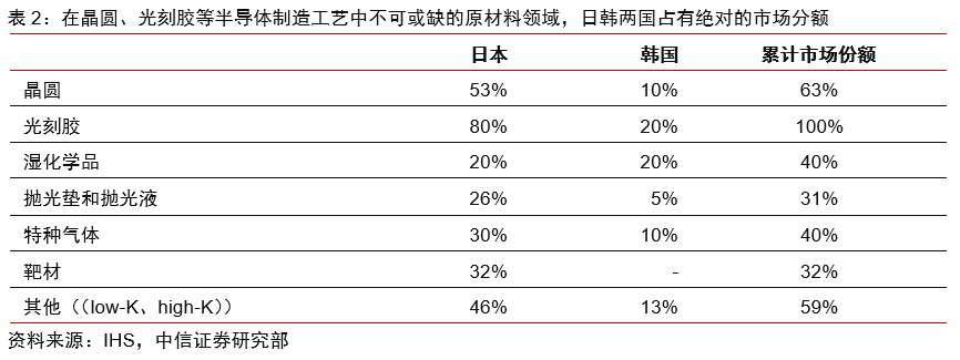 韩国的存储芯片、面板制造和日本的晶圆、光刻胶等半导体制备原材料在全球市场占有绝对领先地位,将更容易传导至下游生产环节。韩国在存储芯片市场占有主导地位,全球第一大和第二大存储芯片厂商——三星和SK海力士都在韩国。目前三星和SK海力士都传出有疑似和确诊病例,若后续由于疫情导致工厂停产则会对全球存储芯片和电子元器件市场产生冲击。而日本在很多半导体制备原材料领域也拥有很高的市场份额,特别是晶圆、光刻胶等半导体制造工艺中不可或缺的原材料,其市场份额都在50%以上。由于部分关键材料几乎由日韩两国垄断,而一旦疫情在这两个国家快速蔓延,将会影响到相关材料企业的正常生产和运输,从而会推升国内部分材料领域涨价,甚至在库存无法满足现有需求时出现断供风险。