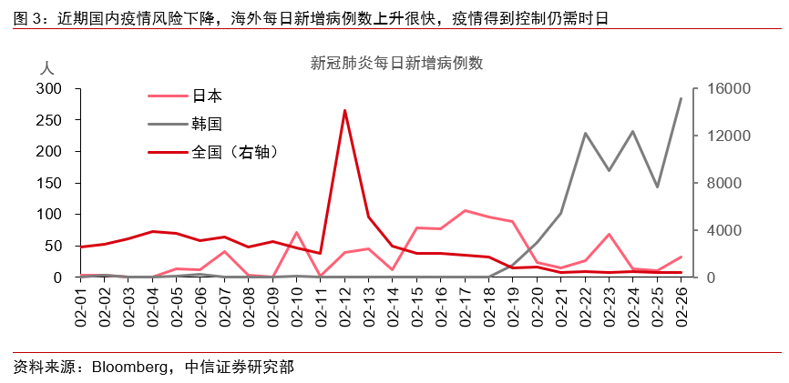 日韩受疫情影响冲击全球产业链的风险明显上升。近期国内疫情风险下降,海外每日新增病例数上升很快,疫情得到控制仍需时日。特别是日韩疫情的升级,后续有可能会触发类似中国的全国性隔离停产措施,从而将严重影响国内的交通物流、企业开工、进出口贸易等。而考虑到日韩在全球产业链上的重要地位,以及与中国在贸易方面的紧密联系,日韩疫情的升级料会对包括中国在内的全球产业链产生明显的冲击。