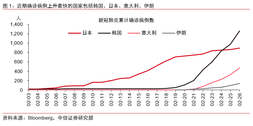 海外新冠疫情在近期愈演愈烈。截至2月26日数据,共有36个海外国家有确诊病例,累计确诊3546人,累计死亡53人;其中韩国和日本最多,分别确诊1261和894人,累计死亡19人。近期确诊病例上升最快的国家包括韩国、日本、意大利、伊朗,其中韩国和日本尤其值得关注。