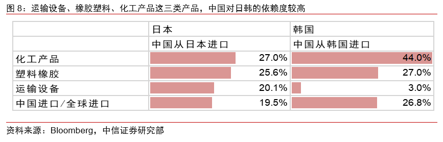 与全球其他国家相比,中国在运输设备、橡胶塑料、化工产品等方面对日韩的依赖度较高。我们按照单个对应进口产品中,中国进口占全球所有进口的比例来衡量中国对单一产品的依赖度。总的来看,中国对日韩所有出口商品的依赖度为19.5%和26.8%,其中进口橡胶塑料、化工产品、运输设备占日本总出口的27.0%、25.6%、20.1%,占韩国总出口的44%、27%、3%。从产品的占比可以发现,橡胶塑料、化工产品、运输设备这三类产品,中国对日韩的依赖度较高,因此更容易受到日韩贸易暂停或受阻的冲击。