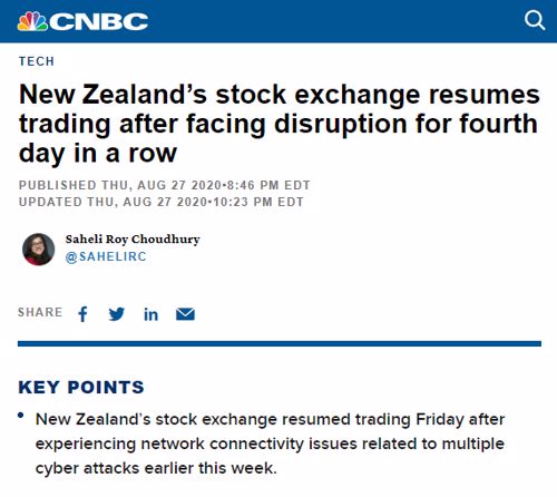 而此前三天,新西兰证券交易所已经因遭遇海外网络攻击,不得不缩短交易时间。
