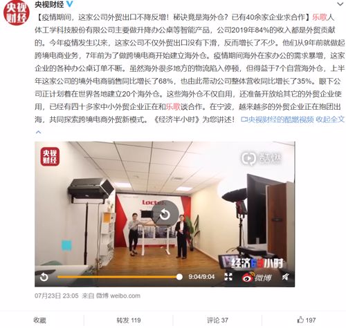 此外,央视《经济半小时》也曾报道这家上市公司,公司2019年84%的收入都是外贸贡献的。今年疫情发生以来,这家公司不仅外贸出口没有下滑,反而增长了不少。他们从9年前就做起跨境电商业务,7年前为了做跨境电商开始建立海外仓。疫情期间海外在家办公的需求暴增,这家企业的各种办公桌订单不断。虽然海外很多地方的物流陷入停顿,但得益于7个自营海外仓,上半年这家公司的境外电商销售同比增长了68%,也由此带动公司整体营收同比增长了35%。眼下公司正计划着在世界各地建立20个海外仓。这些海外仓不仅自用,还准备开放给其它的外贸企业使用,已经有四十多家中小外贸企业正在和乐歌谈合作。在宁波,越来越多的外贸企业正在抱团出海,共同探索跨境电商外贸新模式。