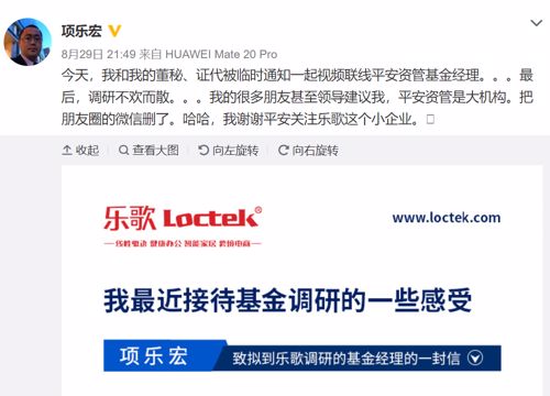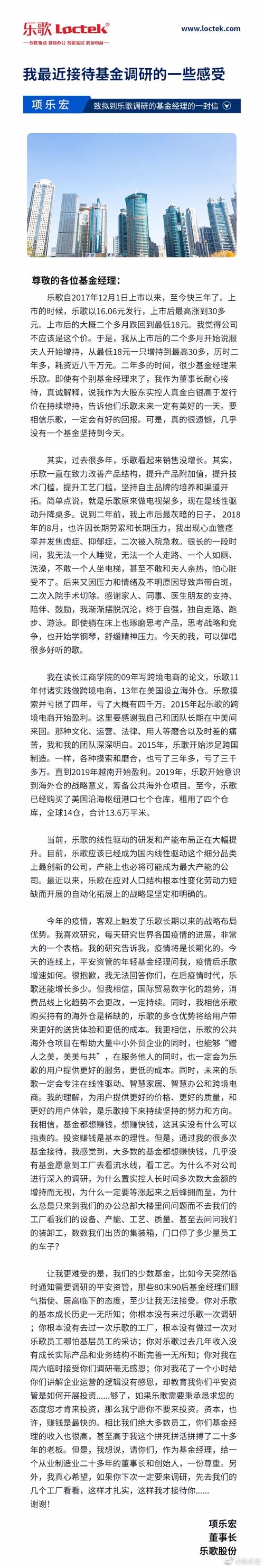 当天深夜11点左右,乐歌股份的董事长项乐宏在微博发文,致拟到乐歌股份调研的基金经理的一封信——《我最近接待基金调研的一些感受》,道出了背后的苦衷和不满,解释了这条朋友圈的缘由。