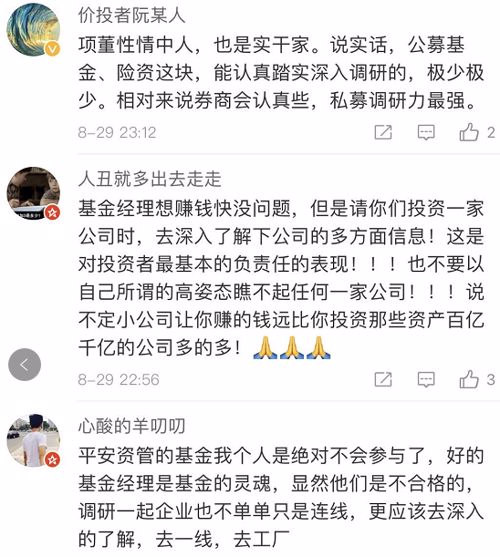其中提到——今天,我和我的董秘、证代被临时通知一起视频联线平安资管基金经理。。。最后,调研不欢而散。。。我的很多朋友甚至领导建议我,平安资管是大机构。把朋友圈的微信删了。