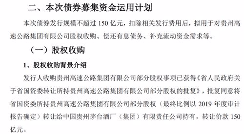 但根据信息披露,贵州省国资委已将所持有的贵州高速的部分股权转让给茅台集团,转让价150亿元,和此次发行债券规模相同。一向以“不差钱”形象示人的