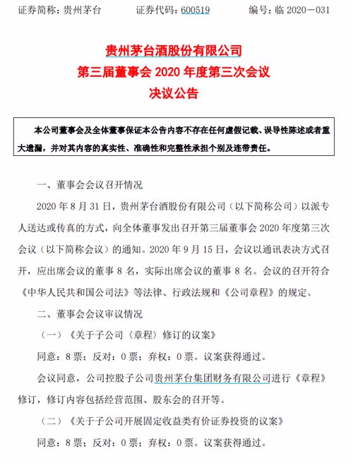 而就在上一日,上市公司贵州茅台酒股份有限公司则发布公告称,公司控股子公司贵州茅台集团财务有限公司开展固定收益类有价证券投资业务,投资总规模不超过其资本总额的70%。