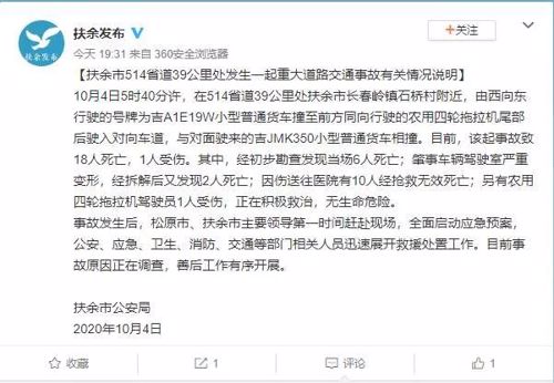 据吉林扶余市公安局发布的通报,10月4日5时40分许,在514省道39公里处吉林省扶余市长春岭镇石桥村附近,由西向东行驶的号牌为吉A1E19W小型普通货车撞至前方同向行驶的农用四轮拖拉机尾部后驶入对向车道,与对面驶来的吉JMK350小型普通货车相撞。目前,该起事故致18人死亡、1人受伤。其中,经初步勘查发现当场6人死亡;肇事车辆驾驶室严重变形,经拆解后又发现2人死亡;因伤送往医院有10人经抢救无效死亡;另有农用四轮拖拉机驾驶员1人受伤,正在积极救治,无生命危险。