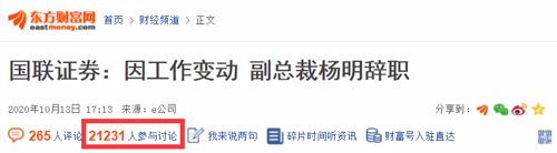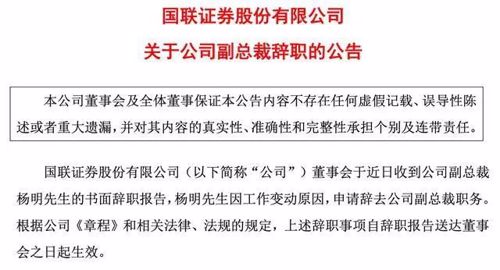 10月13日晚间,国联证券发布公告称,董事会于近日收到公司副总裁杨明先生的书面辞职报告,杨明先生因工作变动原因,申请辞去公司副总裁职务。