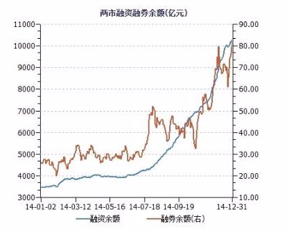 一方面,A股市场的融资融券交易呈现爆发式增长,成为助推股指大涨的最大功臣。2014年的最后两个月,两融余额甚至连续突破8000亿、9000亿和10000亿(12月19日,沪深两市融资融券余额总量达10048.22亿元,首次突破万亿元大关大关),实现三级跳。Wind数据显示,截至12月24日,两融余额达到1.002万亿,相比2010年初,增幅高达188%。在两融冲击万亿关口的过程中,逾三成两融标的股融资余额翻倍。