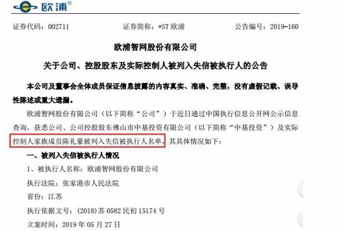 而因违反财产报告制度,*ST欧浦、中基投资及其实际控制人陈礼豪已被列入失信被执行人名单。
