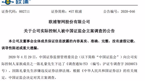 今年5月5日晚间,*ST欧浦发布公告称,4月29日,中国证监会向公司实际控制人家族成员之一陈礼豪下达了《调查通知书》,因其涉嫌违反证券法律法规,中国证监会决定对其立案调查。