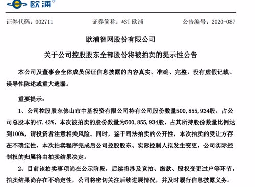 今年11月16日,*ST欧浦发布关于公司控股股东全部股份将被拍卖的提示性公告称,本次被拍卖的股份数量为500,855,934股,占其所持股份数量比例达到100%,请投资者注意相关风险。