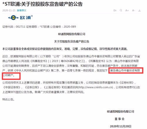 早在去年9月11日, *ST欧浦就公告称,收到控股股东佛山市中基投资有限公司(以下简称“中基投资”)通知,中基投资9月9日以不能清偿到期债务,并且资产不足以清偿全部债务,向佛山市顺德区人民法院申请进行破产清算。