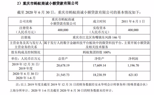 此外,数据显示,截至2020年年中,重庆市蚂蚁商诚小额贷款注册资本40亿元,总资产达2.15亿元,上半年净利润为621.83万元。