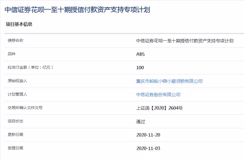 此外,拟发行规模同样为100亿元的“中信证券花呗一至十期授信付款资产支持专项计划”,在11月20日“通过”,这一原始受益人为“