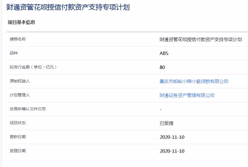 “财通资管花呗授信付款资产支持专项计划”,拟发行规模为80亿。受理时间11月10日。
