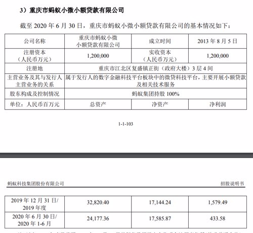 截至2020年6月底,重庆市蚂蚁小微小额贷款注册资本120亿元,总资产2.4亿元,上半年净利润433.58万元。