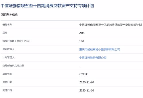 中信证券 借呗五至十四期消费贷款资产支持专项计划”,拟发行规模为100亿元;受理时间11月20日。