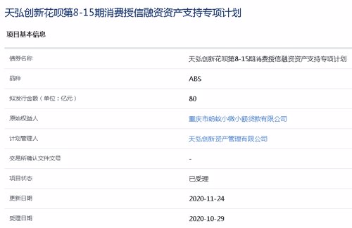 “天弘创新花呗第8-15期消费授信融资资产支持专项计划”,拟发行规模为80亿元;受理时间是10月29日。