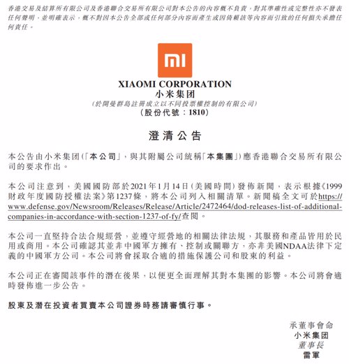 小米集团发布澄清公告称,公司一直坚持合法合规经营,并遵守经营地的相关法律法规,其服务和产品皆用于民用或商用。本公司确认其并非中国军方拥有、控制或关联方,亦非美国NDAA法律下定 义的中国军方公司。本公司将会采取合适的措施保护公司和股东的利益。