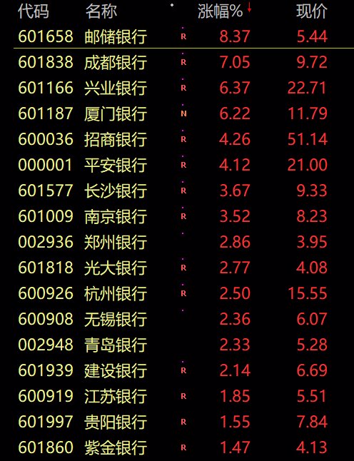 受此消息提振,多只银行股现暴涨态势。获得李录加仓的邮储银行直线涨停,不过,截至收盘邮储银行A股打开涨停板,招商银行涨幅收窄至4%。