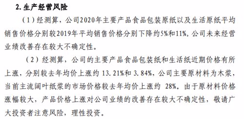 近日,该公司多次发布股票交易风险提示性公告,称公司的主要产品食品包装纸和生活纸近期价格有所上涨,分别较去年均价上涨约13.21%和3.84%,公司主要原材料为木浆,当前主流阔叶纸浆的市场价格较去年均价上涨约28%。由于原材料价格涨幅较大,产品价格上涨对公司业绩的改善存在较大不确定性,敬请广大投资者注意风险,理性投资。