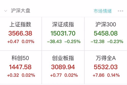 截至收盘,沪指微涨0.01%报3566.38点,深成指跌0.26%,创业板指微涨0.02%。两市合计成交10364亿元,北向资金净流入8.01亿元。