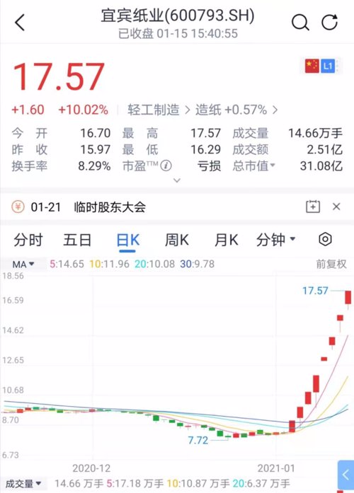1月15日,宜宾纸业高开高走,半小时后封上涨停,而这已经是该股连续收获的第八个涨停板。截至收盘,该股年内涨幅已经高达118%,股价翻倍,报17.57元/股。