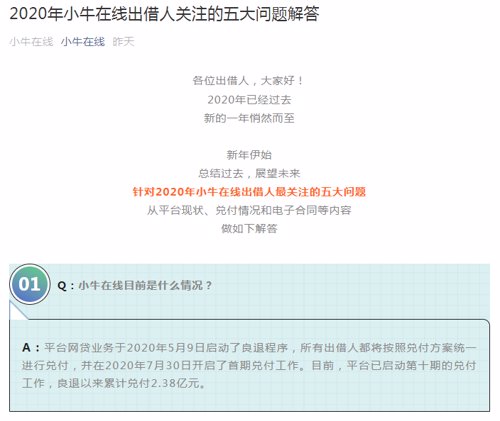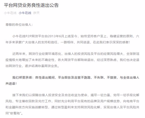 当时小牛在线表示,近两年来,网贷行业经营环境恶化,出借人的投资风险及平台的经营风险增大,全球新冠疫情极大地增加了未来的不确定性,各大网贷平台都陆续退出,经过深思熟虑,我们也决定退出网贷行业,逐步结清存量网贷业务。我们郑重承诺:良性退出期间,平台股东及高管不跑路、不失联、不撤资,与全体出借人共进退!