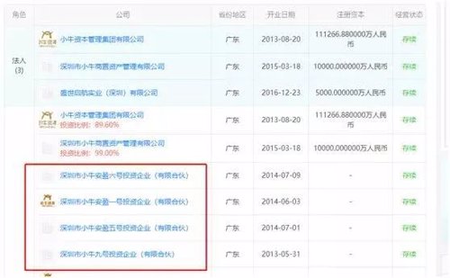 值得一提的是,其在股权投资中最大的特点并不是参股,而是控股,投资占比基本在80%以上,拥有绝对话语权。彭铁个人持有小牛资本89.6%股权,旗下板块小牛在线、小牛金服、小牛普惠、小牛新财富、小牛投资等公司都占据100%股权。