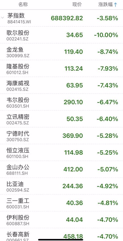 苹果概念同样大跌,市值超千亿元的歌尔股份跌停,油茅”金龙鱼下跌近9%,“光伏茅”隆基股份大跌近8%,海康威视一度触及跌停。